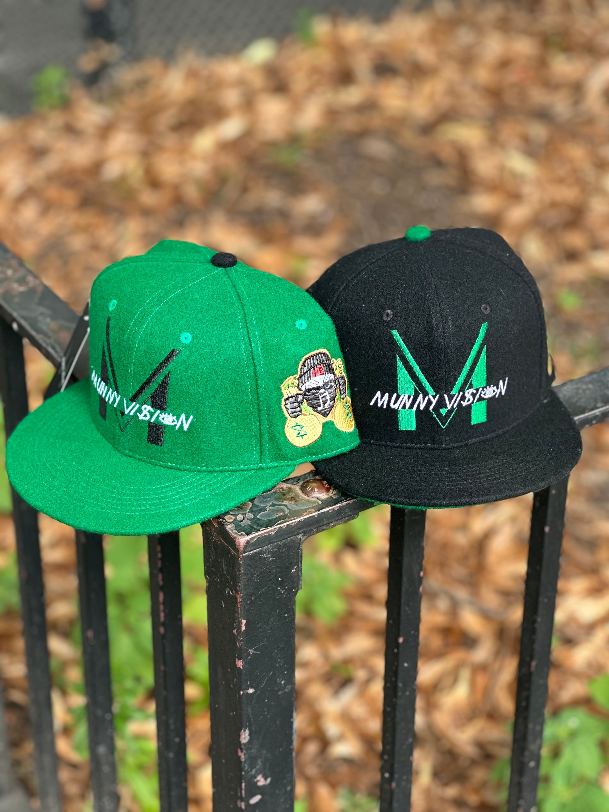 The 2025 MunnyVision Fitted Cap features a flat embroidered "MV" logo at the front panels. Additional details include a snapback closure at the rear and a green undervisor.